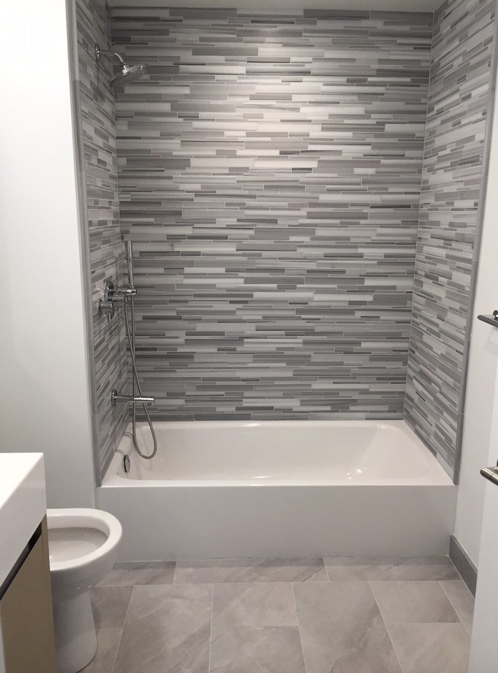 Rental Bath Walls: 12″x24″ Orobico Grey Porcelain Tile